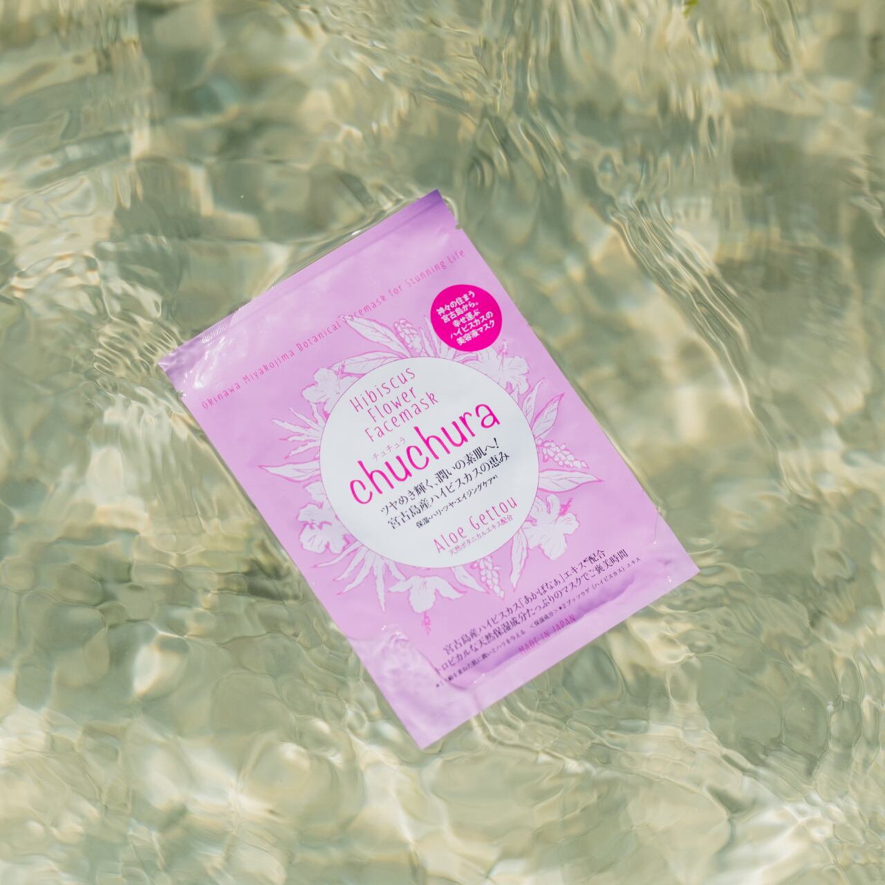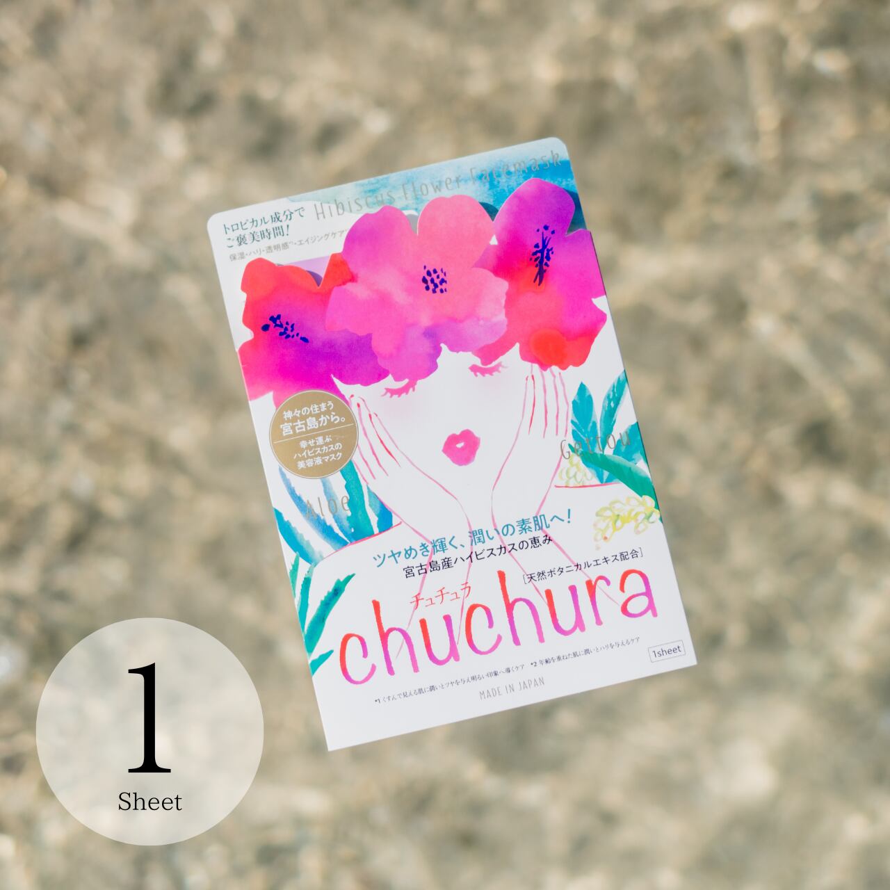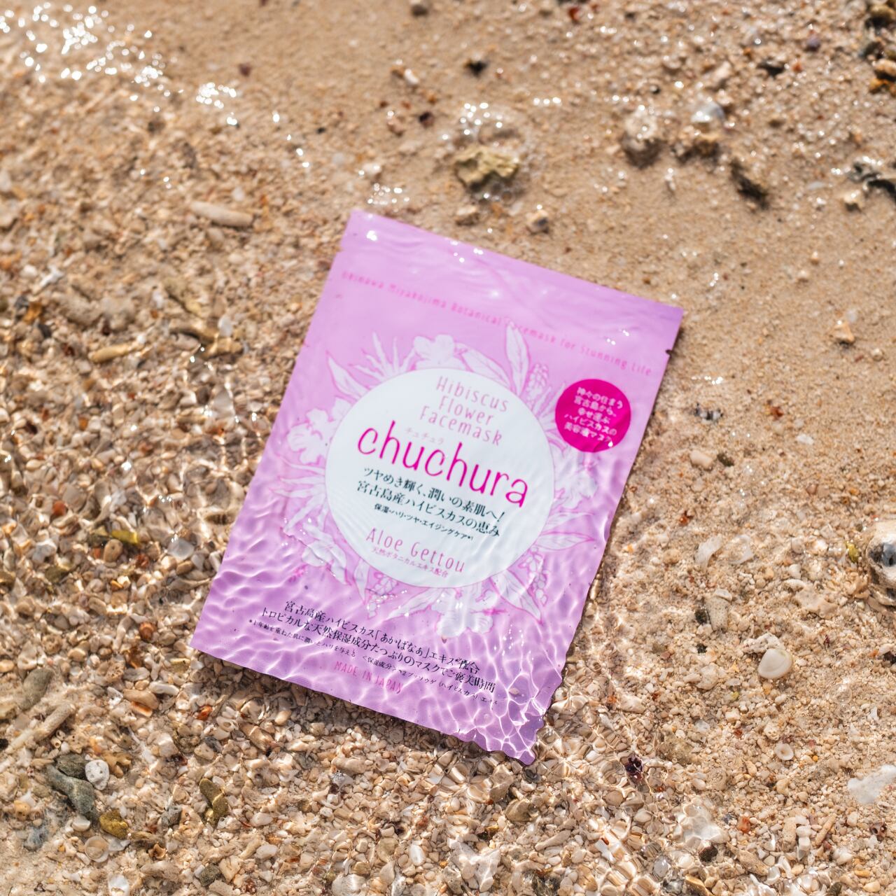 宮古島産ハイビスカスから生まれた、美容液フェイスマスク chuchura【1枚】宮古島産ハイビスカス「あかばなぁ」をひとつひとつ手摘みし、丁寧に抽出したフラワーエキスをたっぷり含ませたボタニカル・フラワーフェイスマスクです。3つの主成分、「あかばなぁ」エキス(ブッソウゲエキス)、アロエエキス(アロエベラ葉水、アロエベラ液汁)、ゲットウ葉エキスの天然植物保湿成分をたっぷり配合しました。角質層にしっかり浸透し、肌に潤いを与えます。天然植物保湿成分がぴったりと肌に密着し、角質層のすみずみまで浸透するマスクケア。くすんで見える肌や年齢を重ねた肌に、しっとりふっくらとした潤いを与え、透明感のあるみずみずしい肌、弾けるようなハリ肌、輝くようなツヤ肌へと導きます。琉球神話に「あかばなぁ(ハイビスカスの沖縄方言)は天と地を繋ぎ、幸せを運ぶ縁えにしの花」という一節があるのをご存知ですか?珊瑚礁が隆起して出来た宮古島の土壌にはミネラルなど海の恵みが溢れ他のどのハイビスカスよりも赤く染まる花弁には太陽の恵みが凝縮されています。宮古島産ハイビスカスから生まれた、美容液フェイスマスク chuchuraが、皆さまのもとへ幸せと健康的な美を運びます。
