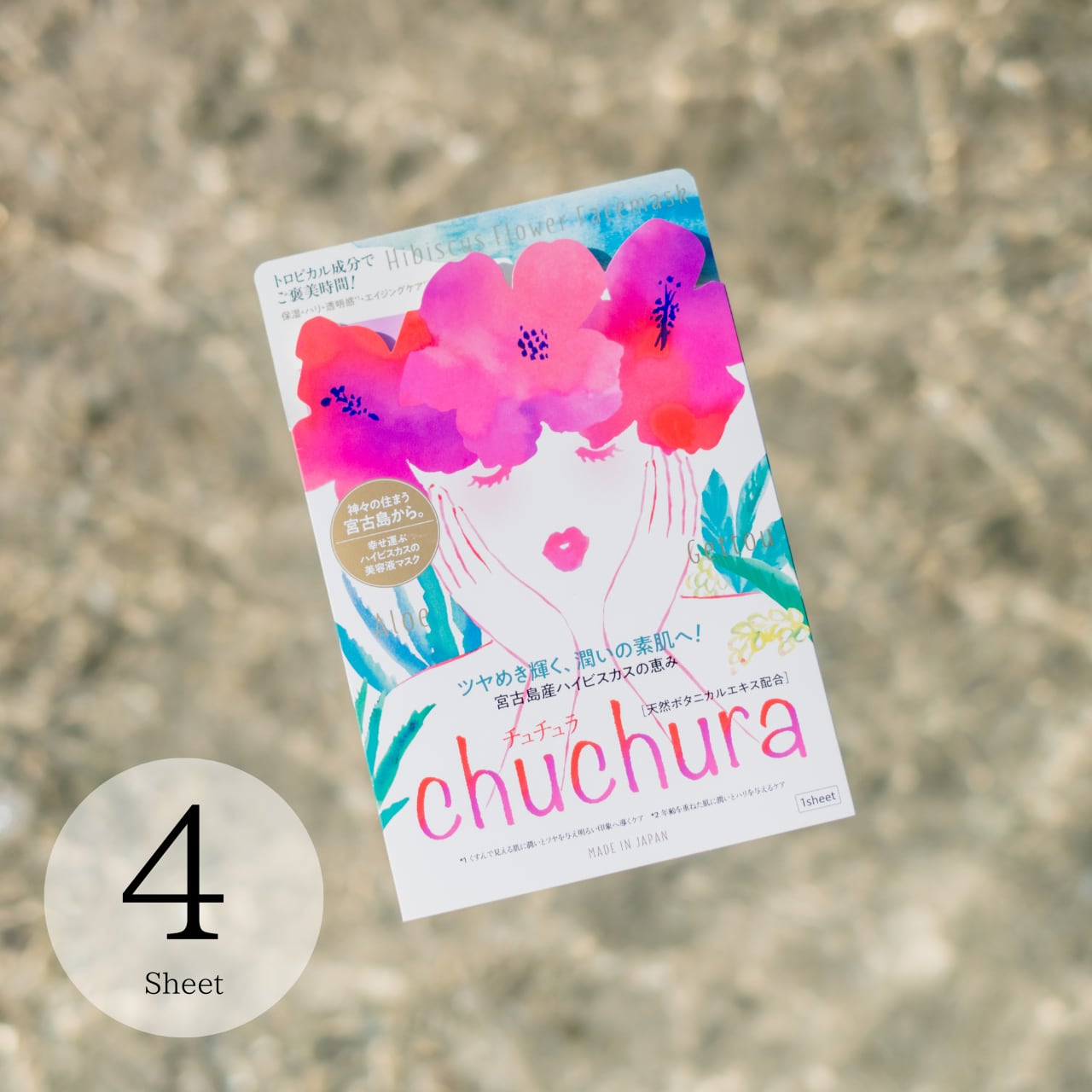 宮古島産ハイビスカスから生まれた、美容液フェイスマスク chuchura【1枚】宮古島産ハイビスカス「あかばなぁ」をひとつひとつ手摘みし、丁寧に抽出したフラワーエキスをたっぷり含ませたボタニカル・フラワーフェイスマスクです。3つの主成分、「あかばなぁ」エキス(ブッソウゲエキス)、アロエエキス(アロエベラ葉水、アロエベラ液汁)、ゲットウ葉エキスの天然植物保湿成分をたっぷり配合しました。角質層にしっかり浸透し、肌に潤いを与えます。天然植物保湿成分がぴったりと肌に密着し、角質層のすみずみまで浸透するマスクケア。くすんで見える肌や年齢を重ねた肌に、しっとりふっくらとした潤いを与え、透明感のあるみずみずしい肌、弾けるようなハリ肌、輝くようなツヤ肌へと導きます。琉球神話に「あかばなぁ(ハイビスカスの沖縄方言)は天と地を繋ぎ、幸せを運ぶ縁えにしの花」という一節があるのをご存知ですか?珊瑚礁が隆起して出来た宮古島の土壌にはミネラルなど海の恵みが溢れ他のどのハイビスカスよりも赤く染まる花弁には太陽の恵みが凝縮されています。宮古島産ハイビスカスから生まれた、美容液フェイスマスク chuchuraが、皆さまのもとへ幸せと健康的な美を運びます。